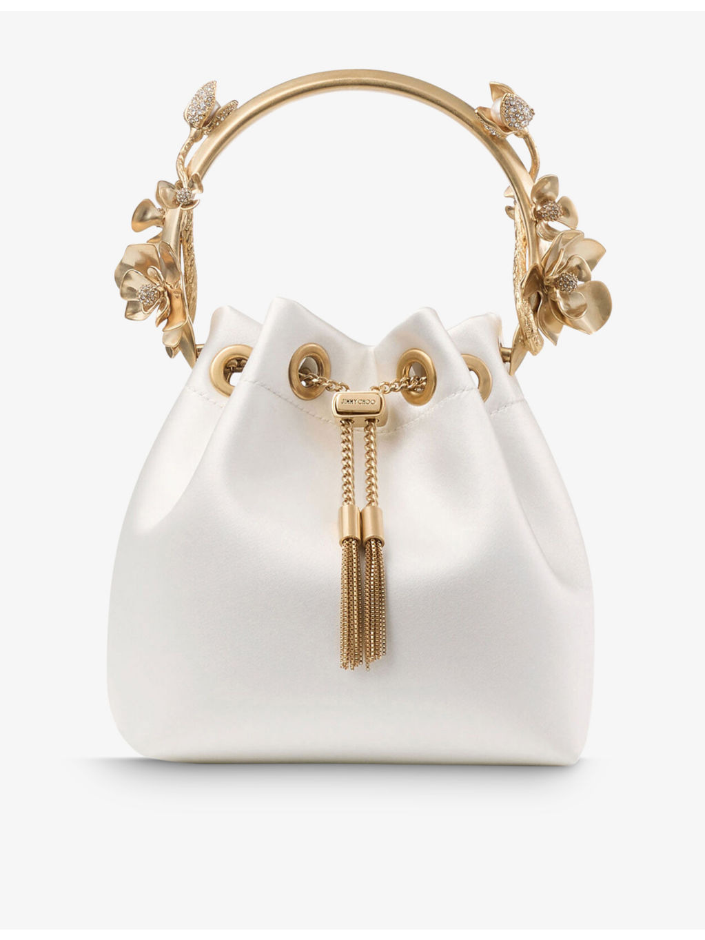 PRODUCT DETAILS - Jimmy Choo satin cross-body bag - 100% satin - Drawstring-chain closure - Bracelet top handle with crystal embellishments, tassel chain, gold-toned hardware, brand embossed plaque, flower embellishment at the handle, internal pocket, chain strap, fully lined - Height 14cm, width 15cm, depth 9.5cm - Wipe with a clean, dry cloth - Made in Italy Ref: R04401776