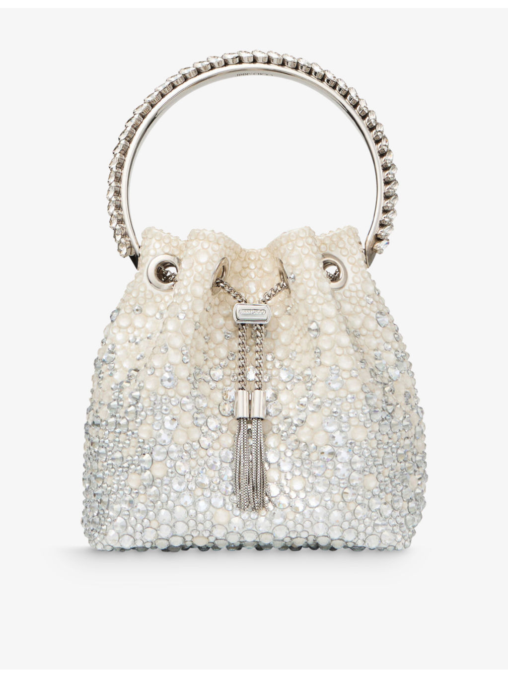 PRODUCT DETAILS - Jimmy Choo woven cross-body bag - 100% fabric - Drawstring-chain closure - Bracelet top handle with crystal embellishments, tassel chain, silver-toned hardware, brand embossed plaque, all-over gem embellishment, internal pocket, chain strap, fully lined - Height 14cm, width 15cm, depth 9.5cm - Wipe with a clean, dry cloth - Made in Italy Ref: R04401774