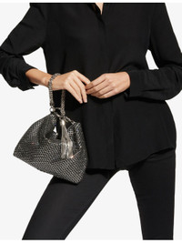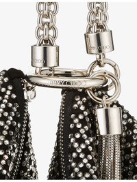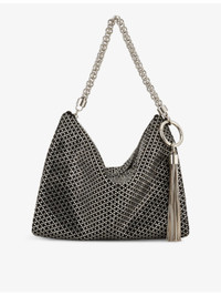 PRODUCT DETAILS - Jimmy Choo leather clutch bag - 100% leather - Zip fastening - Chain-link handle, two-tone design, all-over crystal embellishment, slouchy silhouette, tassel trim, compartmentalised interior, logo-engraved hardware, silver-tone hardware - Height 20cm, width 24cm, depth 3.5cm, max strap drop 9cm - Wipe with a clean, dry cloth - Made in Italy - Presented with a Jimmy Choo dust bag Ref: 834-10132-J000102967