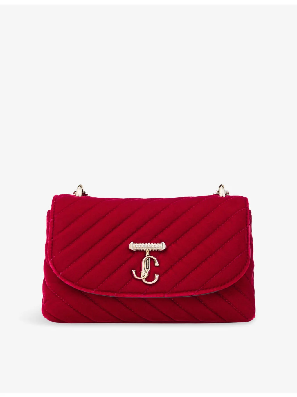 PRODUCT DETAILS - Jimmy Choo velvet crossbody bag - 100% velvet - Flap-over with clasp closure - Soft shape, sliding chain strap, logo hardware charm at front, one main compartment, quilted design, polished hardware - Height 11cm, width 8cm, length 19cm - Wipe with a clean, dry cloth Ref: R04549712
