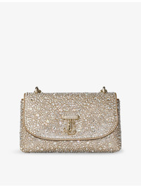 PRODUCT DETAILS - Jimmy Choo suede cross body bag - 100% suede - Magnetic fastening - Long chain strap, all-over rhinestone embellishments, curved flap front, brand hardware to flap, gold-toned hardware, one main interior compartment, interior slip pocket - Height 11cm, width 19cm, depth 8cm - Wipe with a clean, dry cloth - Made in Italy Ref: R04500265