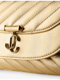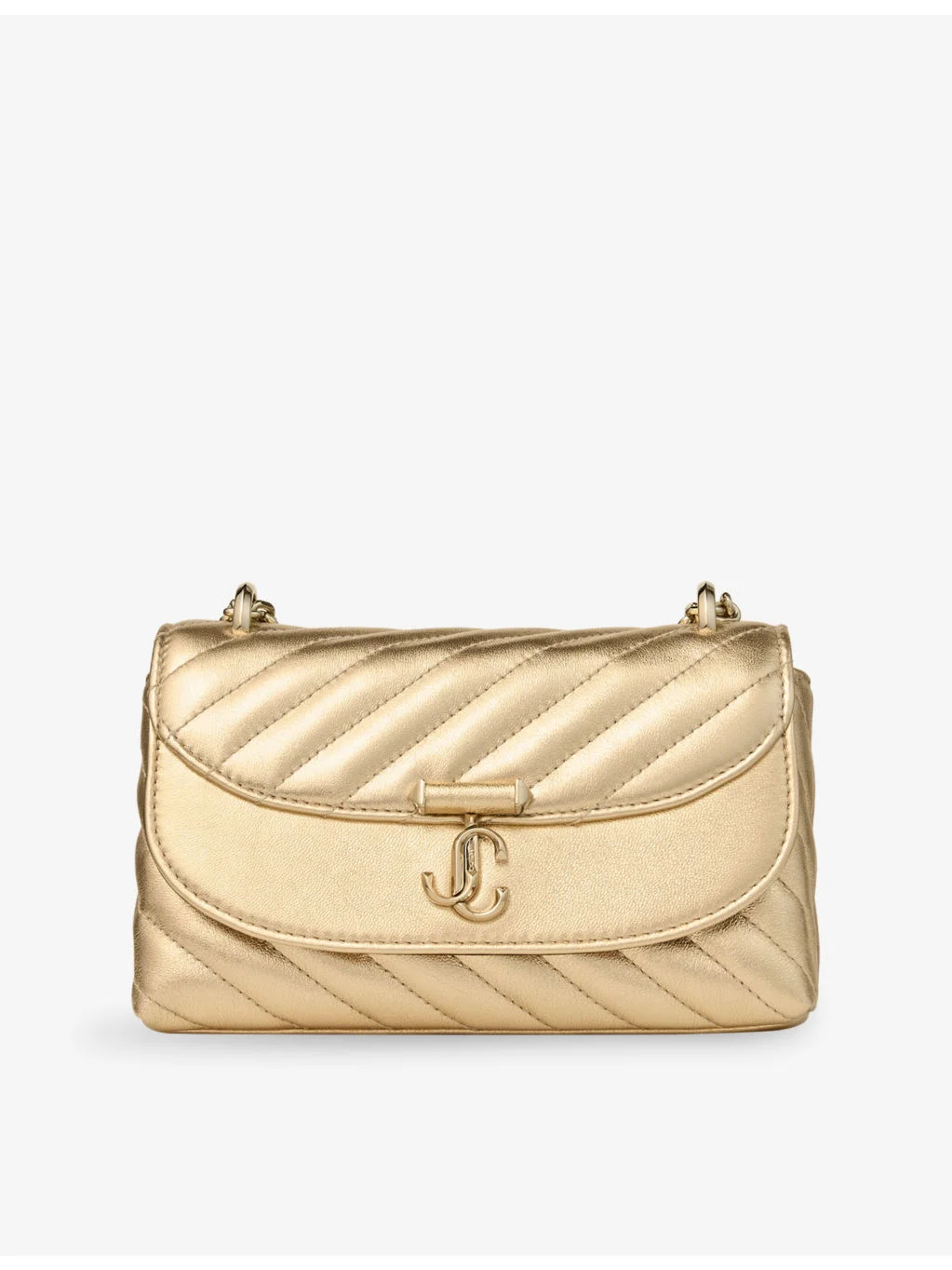 PRODUCT DETAILS - Jimmy Choo leather cross body bag - 100% leather - Magnetic fastening - Rectangle shaped, long chain strap, striped quilting, curved flap front, layered flap, brand hardware to flap, gold-toned hardware, one main interior compartment, interior slip pocket, all-over metallic finish - Height 11cm, width 19cm, depth 8cm - Specialist leather clean - Made in Italy Ref: R04581992