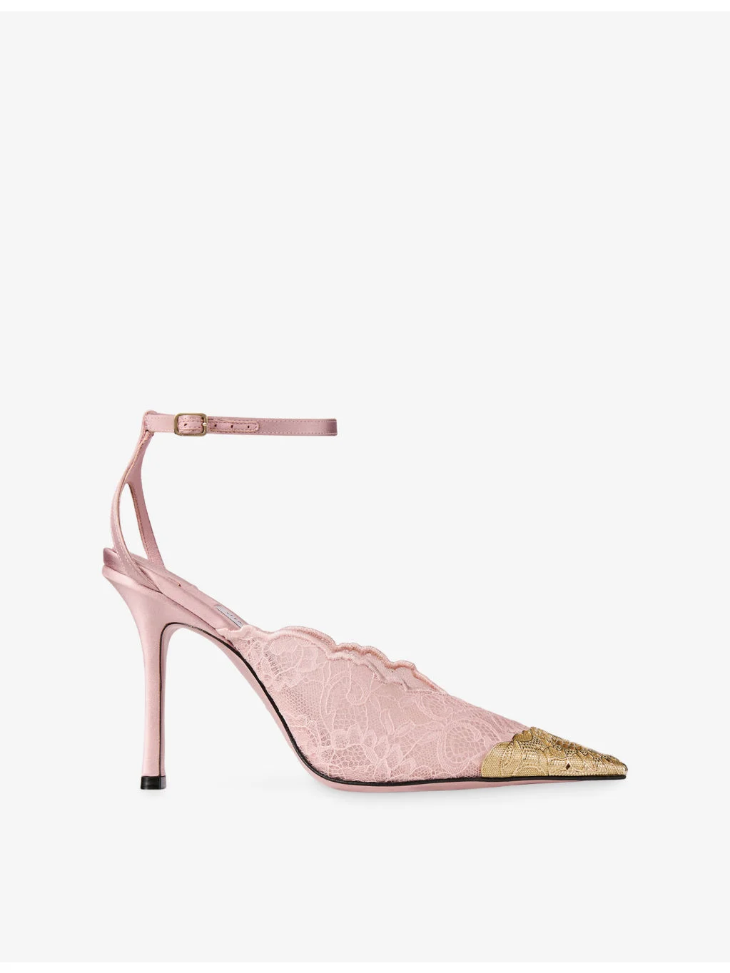 PRODUCT DETAILS - Jimmy Choo lace pumps - 100% lace - Ankle-buckle fastening - Pointed toe, gold-tone metal toecap, floral lace, stiletto heel - Heel height 100mm - Specialist clean - Upper: 100% lace - Lining: 100% leather - Sole: 100% leather Ref: R04549790