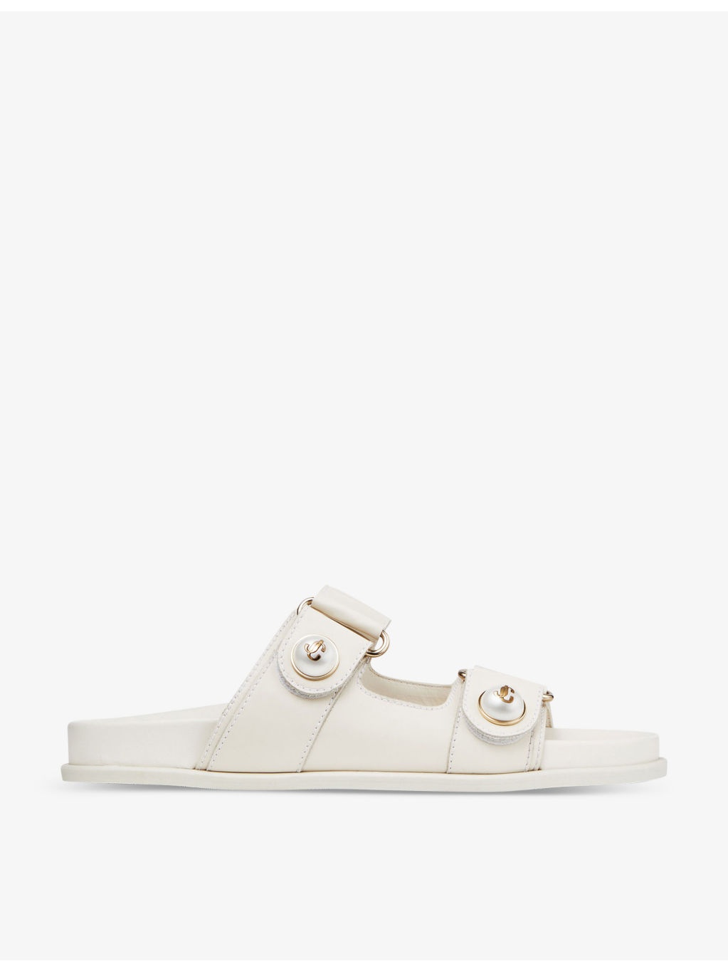 PRODUCT DETAILS - Jimmy Choo leather sandals - 100% leather - Buckle fastening - Round open toe, adjustable double strap fastening, pearl embellishment, JC monogram, branded outsole - Specialist leather clean - Made in Italy - Upper: 100% leather - Lining: 100% leather - Sole: 100% rubber Ref: R04145904