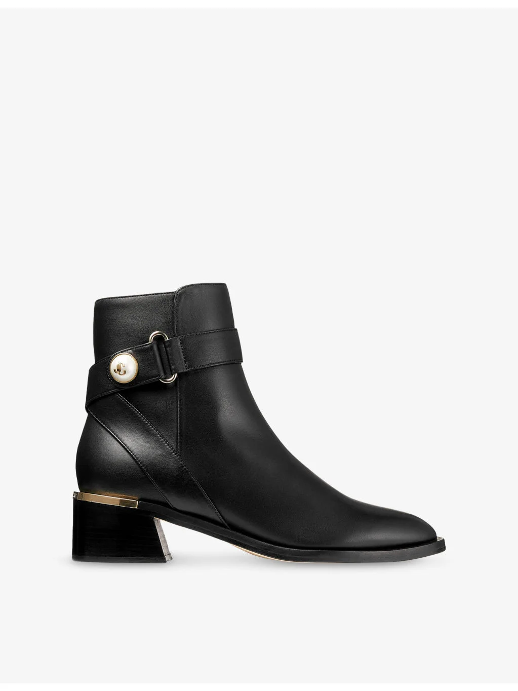 PRODUCT DETAILS - Jimmy Choo leather boots - 100% leather - Zip at side - Round toe, buckle trim with pearlescent embellishment, branded polished hardware, low heel - Heel height 45mm - Specialist leather clean - Upper: 100% leather - Lining: 100% leather - Sole: 100% rubber Ref: R04558622