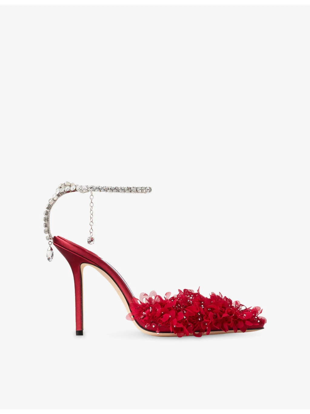 PRODUCT DETAILS - Jimmy Choo satin and mesh pumps - 100% satin; 100% mesh - Clasp fastening - Pointed toe, 3D petal embroidery, rhinestone-embellished petals, crystal-embellished ankle strap, stiletto heel - Heel height 100mm/3.9 inches - Wipe with a clean, dry cloth - Made in Italy - Upper: 100% satin; 100% mesh - Lining: 100% leather - Sole: 100% leather Ref: R04549865