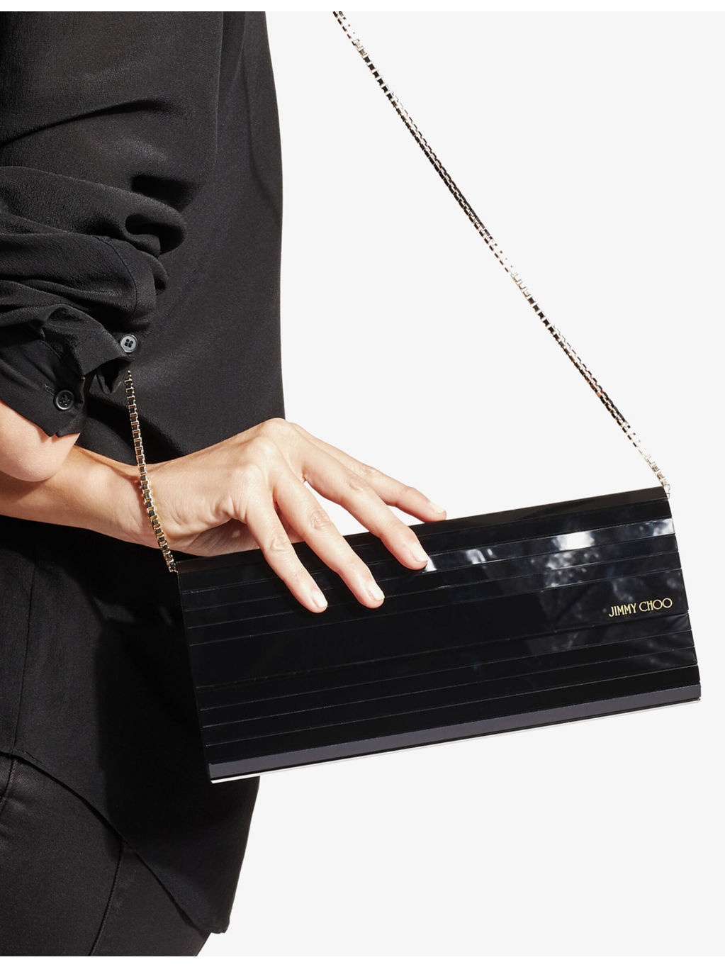 PRODUCT DETAILS - Jimmy Choo acrylic clutch bag - 100% acrylic - Magnetic fastening - Rectangle shape, logo print at front, panelled design, one main compartment, internal slip pocket, lined, detachable chain strap, gold-tone hardware - Length 24cm, height 10cm, depth 5cm - Wipe with a clean, dry cloth Ref: R03863943