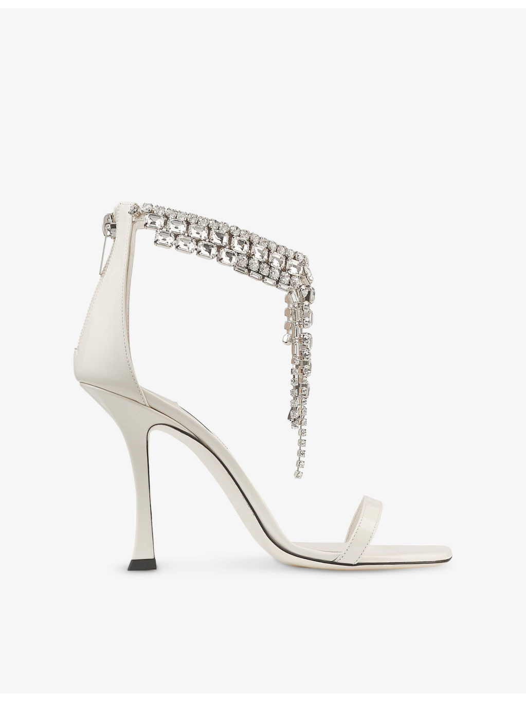 PRODUCT DETAILS - Jimmy Choo patent-leather heeled sandals - 100% patent leather - Adjustable buckle fastening - Open square toe, crystal embellishment ankle strap, single strap at front, stiletto heel - Heel height 3.9in - Specialist leather clean - Upper: 100% patent leather - Lining: 100% leather - Sole: 100% synthetic Ref: R04401888