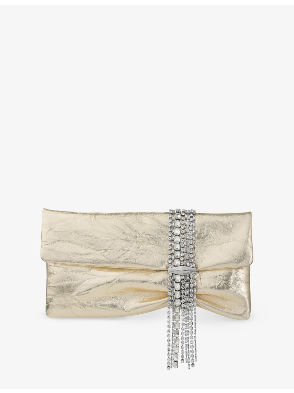 PRODUCT DETAILS - Jimmy Choo leather clutch - 70% calf leather, 15% crystal, 15% brass - Magnetic fastening - Rectangular shape, crystal embellishment at front, engraved logo, ruched trim, foldover top, one main compartment, one slip pocket at interior, fully lined, crinkled finish - Height 15cm, width 25cm, depth 3cm - Specialist leather clean - Made in Italy Ref: R04401898