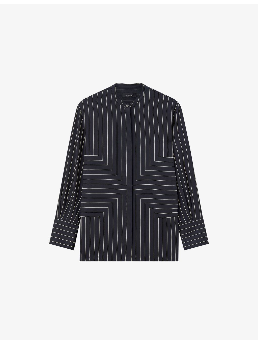 PRODUCT DETAILS - JOSEPH stretch silk-blend blouse - 47% silk, 44% viscose, 9% elastane - Concealed button fastenings at front - Relaxed fit, band collar, long sleeves, all-over geometric striped pattern, wide cuffs, buttoned cuffs, side slits at hem - Dry clean only - True to size - Lightweight, slight stretch Ref: R04506170