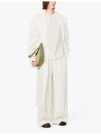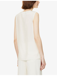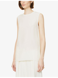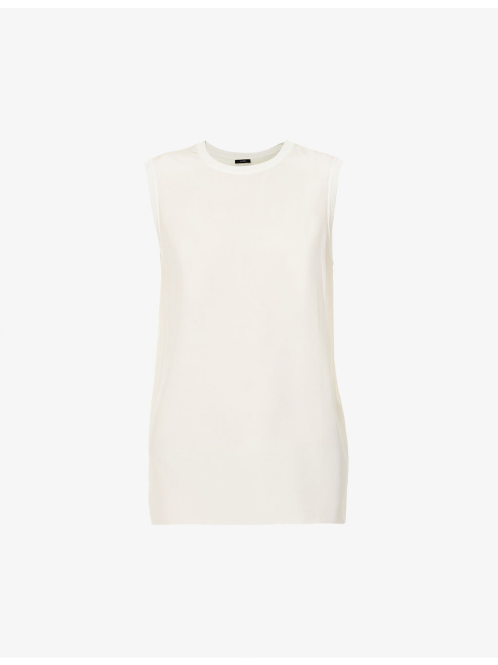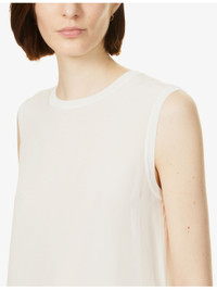 PRODUCT DETAILS - JOSEPH silk top - 100% silk; trim 77% viscose, 20% polyamide, 3% elastane - Slips on - Relaxed fit, round neck, short sleeves, elasticated ribbed trims, all over semi-sheer weave - Hand wash - True to size - Size UK 8: length 26in / 68cm - Model is 5ft 10in/1.78m and wears a size UK 8 - Lightweight, non-stretch Ref: R03900839