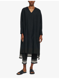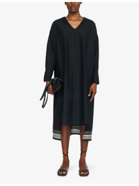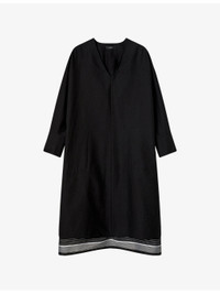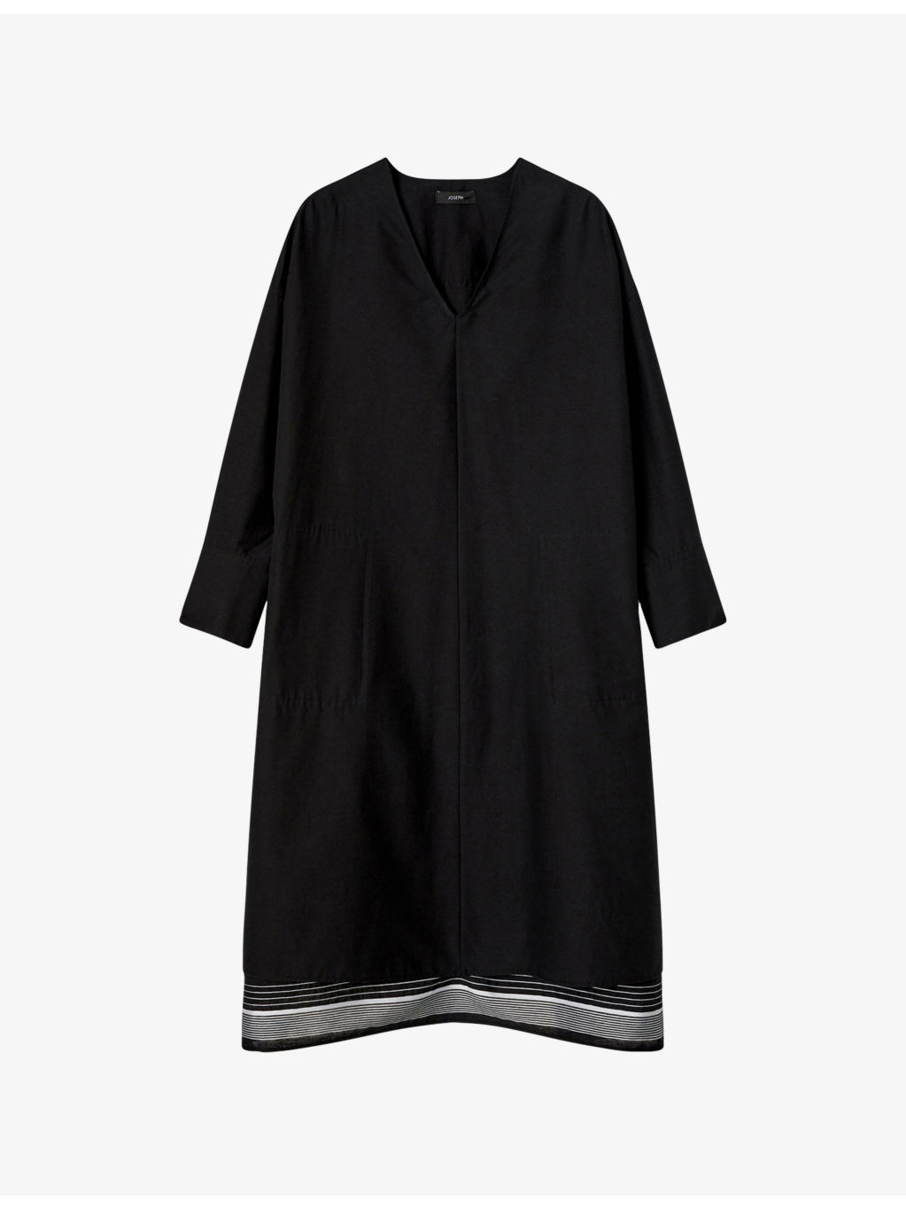 PRODUCT DETAILS - JOSEPH cotton-blend midi dress - 87% cotton, 11% silk, 2% viscose - Slips on - Relaxed fit, V-neck, long sleeves, side pocket, striped trim to hem - Dry clean - True to size - Model is 5ft 10in / 1.78m and wears a size UK 10 - Lightweight, non-stretch Ref: R04471567