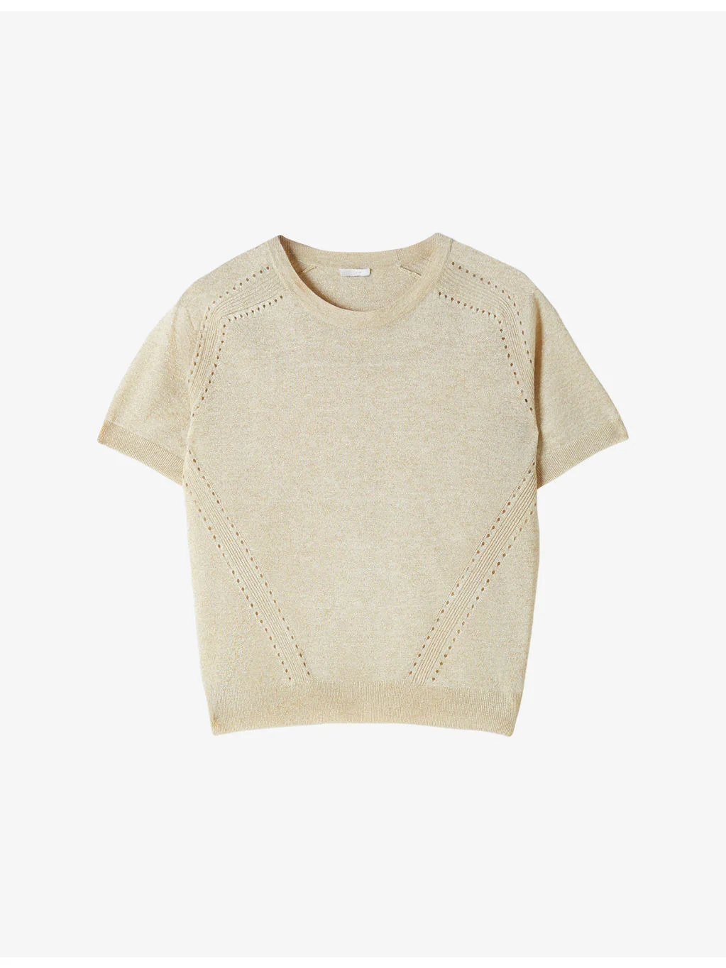 PRODUCT DETAILS - JOSEPH knitted top - 70% viscose, 15% polyester, 15% metallic fibres - Regular fit, round-neck, short sleeves, pointelle detailing, semi-sheer finish, metallic thread - Hand wash - True to size - Lightweight, slight stretch Ref: R04545448