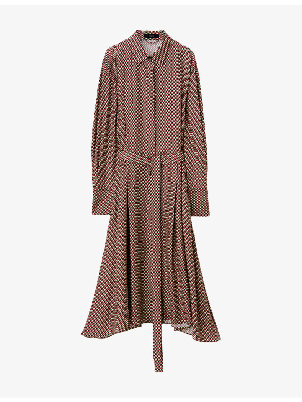 PRODUCT DETAILS - JOSEPH silk-blend dress - 72% lyocell, 28% silk - Concealed button fastenings at front - Regular fit, classic collar, long sleeves, belted at the waist, all-over overlay print - Dry clean - True to size - Model is 5ft 10in/1.78m and wears a size medium - Lightweight, non-stretch Ref: R04519412