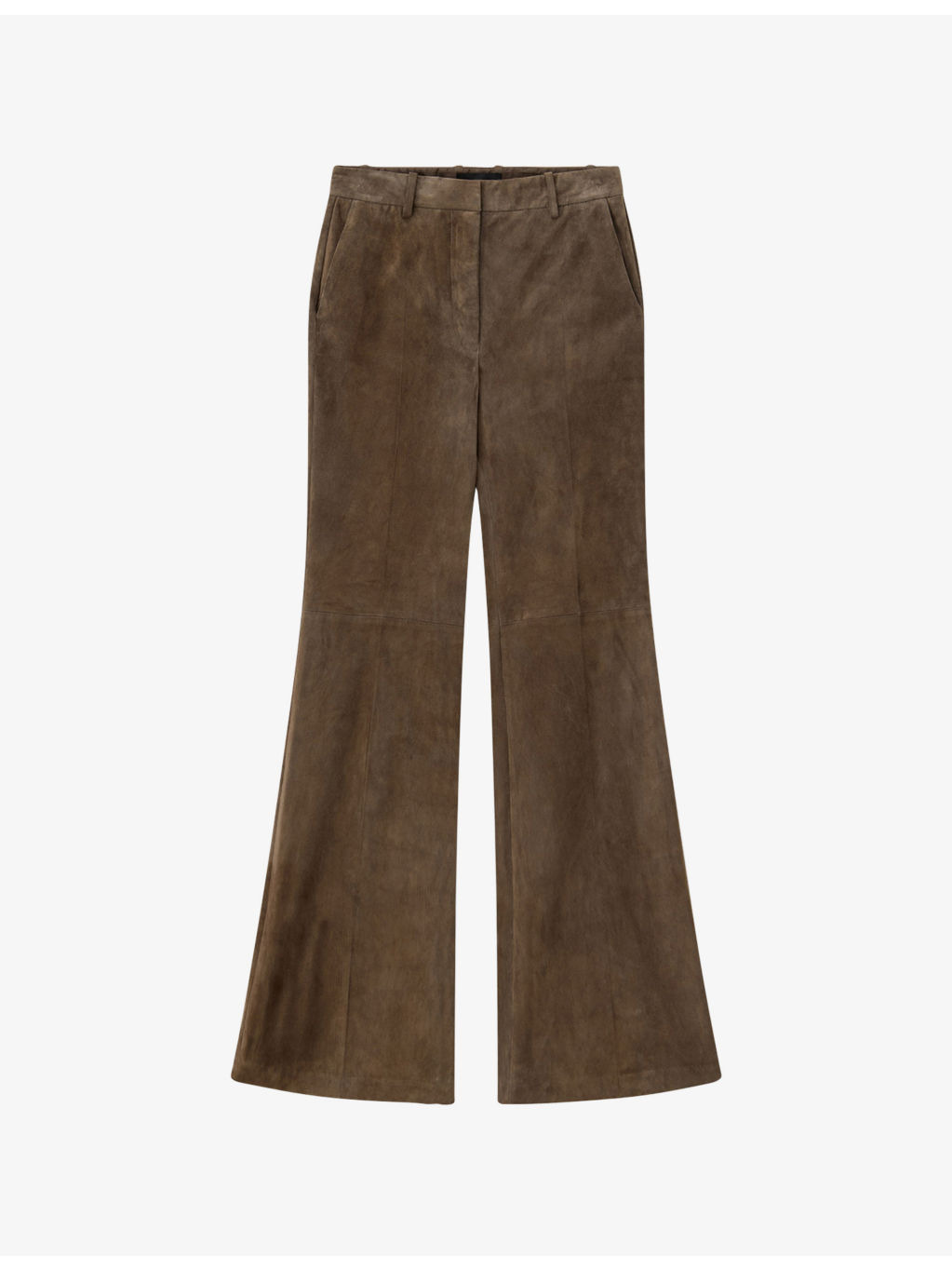 PRODUCT DETAILS - Joseph suede trousers - 100% leather - Button and zip-fly fastening - Regular fit, mid-rise, flared leg, structured waistband, slip pockets at front, panelled - Specialist leather clean - True to size - Model is 5ft 10in/1.78m and wears a size UK 8 - Midweight, slight stretch Ref: R04519457