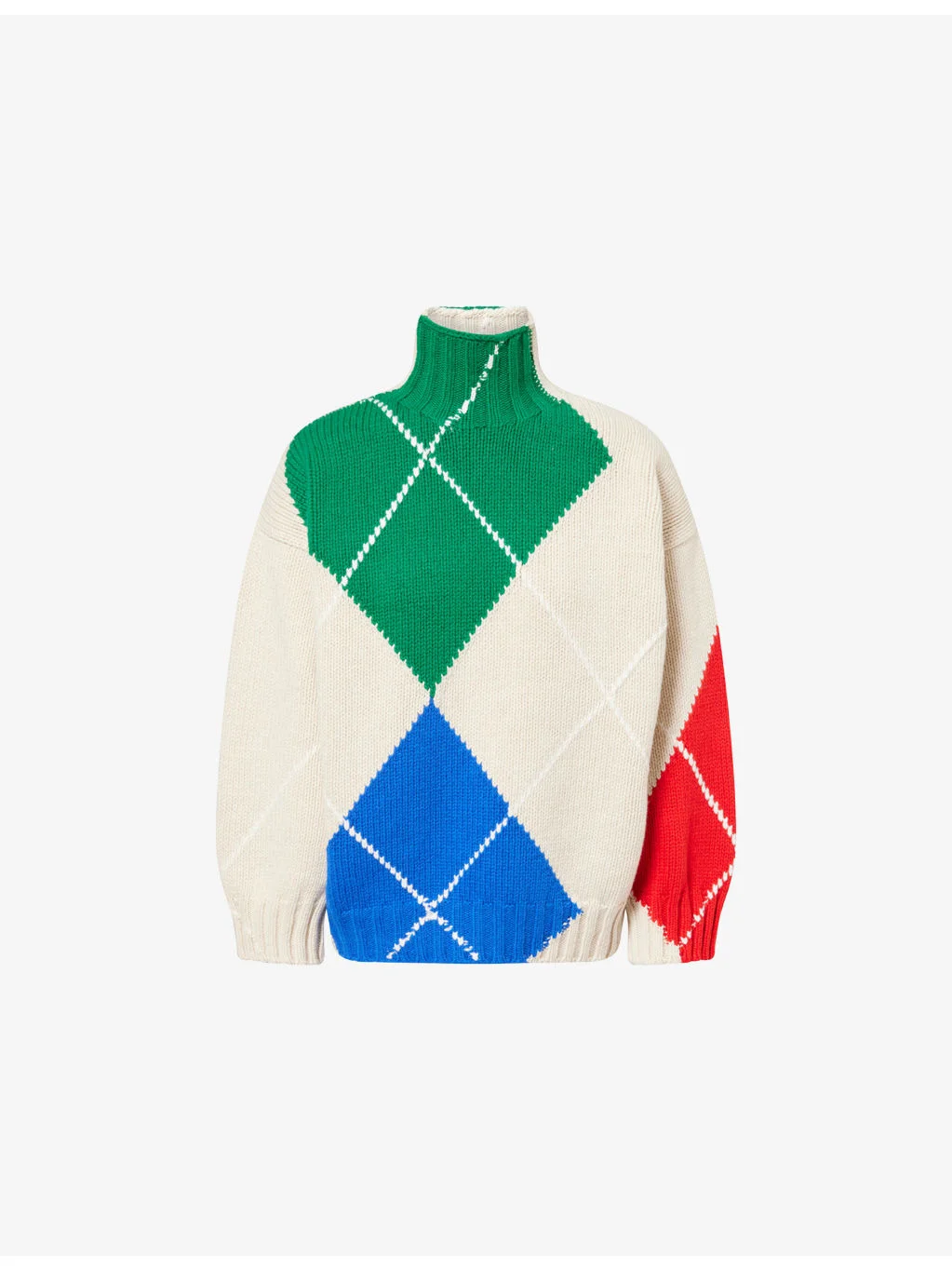 PRODUCT DETAILS - JW Anderson x Pringle wool jumper - 100% wool - Relaxed oversized fit, turtleneck, long sleeves, dropped shoulders, large argyle knit pattern, ribbed trims - Hand wash - Made in UK - True to size - Model is 5ft 10in/1.78m and wears a size small - Midweight, stretchy Ref: R04569601