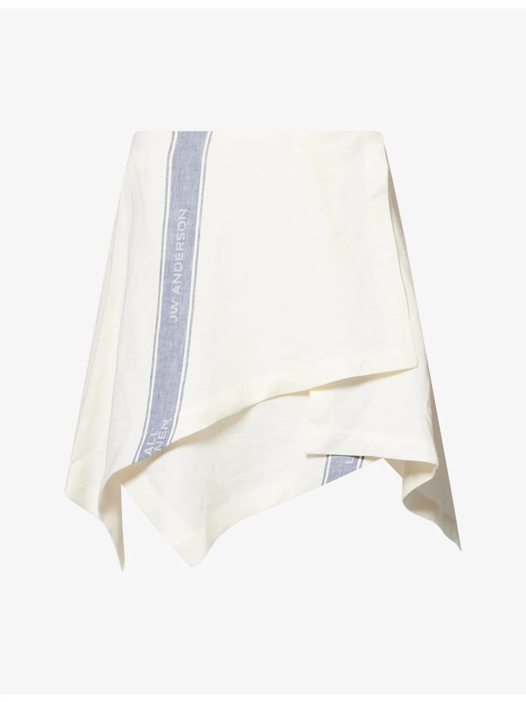 PRODUCT DETAILS - JW Anderson linen mini skirt - 100% linen - Concealed zip fastening at back - Regular fit, mid-rise, contrast brand print, handkerchief draped silhouette, mini length - Dry clean - Made in Portugal - True to size - Size UK 8: length 23in / 59cm - Model is 5ft 10in/1.78m and wears a size UK 8 - Lightweight, non-stretch Ref: R04569594