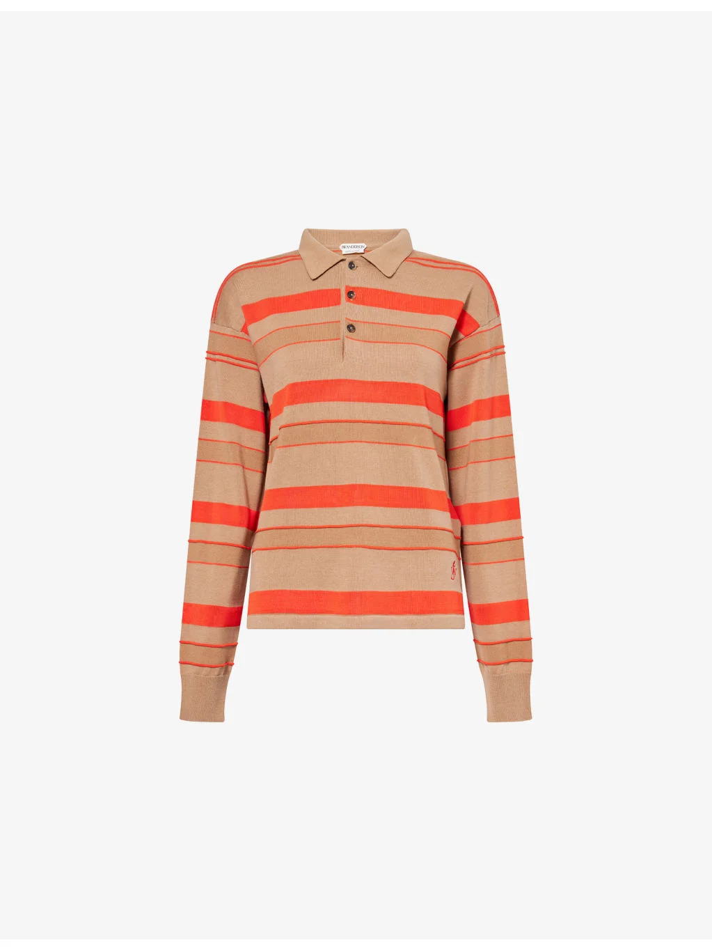 PRODUCT DETAILS - JW Anderson knitted polo top - 45% cotton, 29% viscose, 26% wool - Regular fit, rugby collar, buttoned placket, long sleeves, ribbed cuffs, all-over vertical stripe - Dry clean - Made in Italy - True to size - Model is 5ft 10in/1.78m and wears a size small - Lightweight, stretchy Ref: R04569585