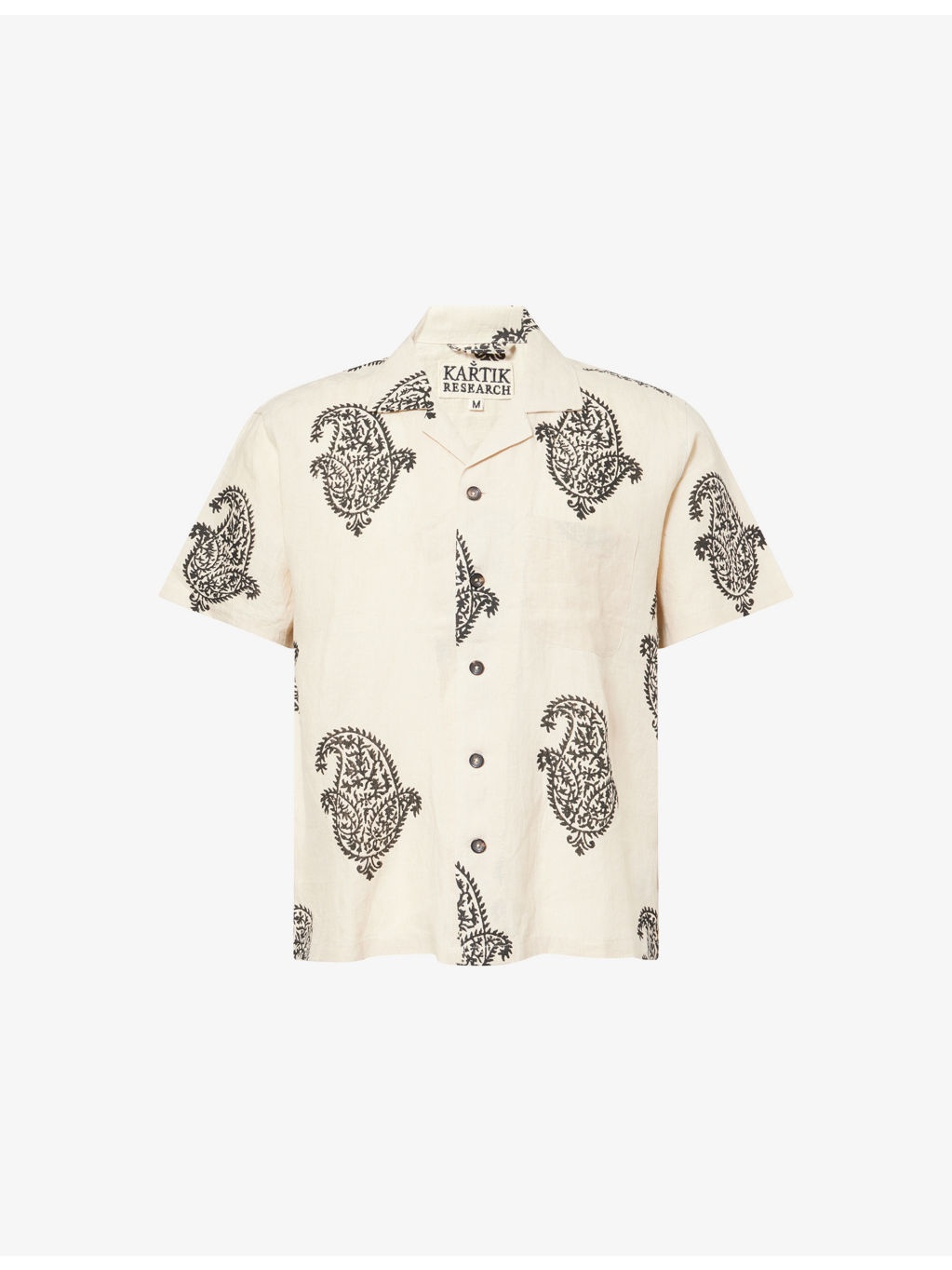 PRODUCT DETAILS - Kartik Research linen shirt - 100% linen - Button fastening at fornt - Oversized, boxy-fit, classic collar, short sleeves, one patch pocket at front, all-over embroidered motifs at front and back - Dry clean only - Made in India - Size medium: length 29.1in / 74cm, chest 47.2in / 120cm - Model is 6ft 2in/1.88m and wears a size medium - Lightweight, non-stretch Ref: R04461222
