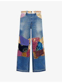 PRODUCT DETAILS - Kartik Research denim jeans - 100% cotton - Button and zip-fly fastening - Relaxed fit, mid-rise, wide leg, structured beaded waistband with belt loops, slip pockets at front, patch pockets at back, contrast patchwork, frayed hems - Dry clean only - Made in India - Size medium: rise 12in / 31cm, inside leg 31in / 79cm, leg opening 21in / 53cm - Model is 6ft 2in/1.88m and wears a size medium - Midweight, non-stretch - Due to the remade nature of this style, each piece will have a unique wash Ref: R04549658