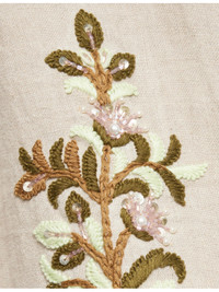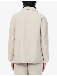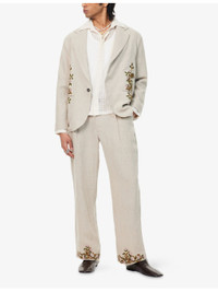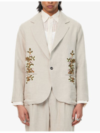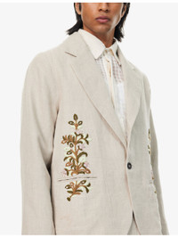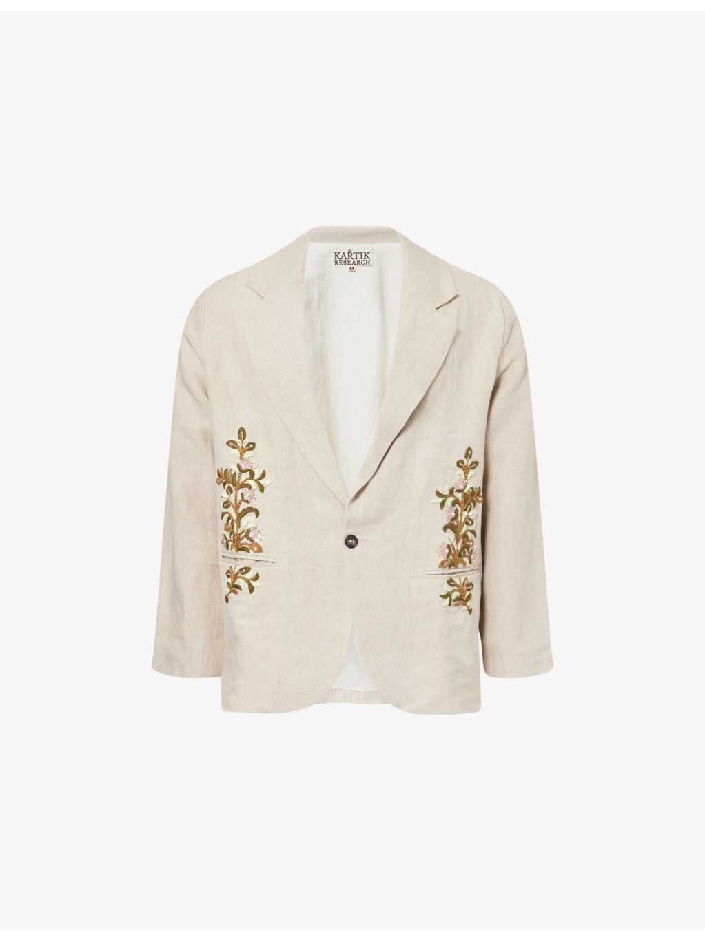 PRODUCT DETAILS - Kartik Research linen blazer - 100% linen - Exposed popper fastenings at front - Single breasted, notched lapels, long sleeves, two jetted pockets at front, embroidered detailing detailing, fully lined - Dry clean only - Made in India - Size medium: length 30.7in / 78cm, chest 45.6in / 116cm - Model is 6ft 2in/1.88m and wears a size medium - Lightweight, non-stretch Ref: R04460848