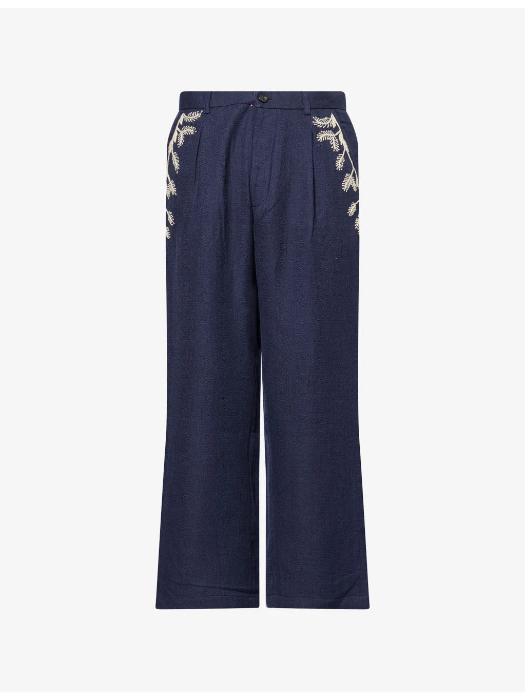 PRODUCT DETAILS - Kartik Research wool trousers - 100% wool - Button, hook-and-eye and zip-fly fastening - Regular fit, mid-rise, straight leg, structured waistband with belt loops, slip pockets at front, contrast floral embroidery at front, pockets at back, diamond weave texture - Dry clean only - Made in India - Size medium: rise 12in / 31cm, inside leg 31in / 79cm, leg opening 20in / 51cm - Model is 6ft 2in/1.88m and wears a size medium - Midweight, non-stretch Ref: R04549656