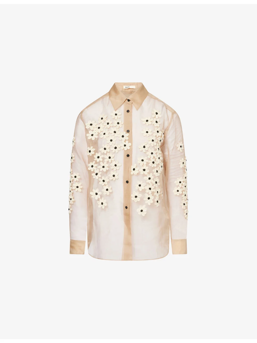 PRODUCT DETAILS - KHAITE silk shirt - 100% silk - Exposed button fastenings at front - Relaxed fit, pointed collar, long sleeves, buttoned cuffs, gold-toned hardware, floral appliques at front, shirttail hem, silk organza texture - Wipe with a clean, dry cloth - Made in USA - True to size - Size small: length 29in / 74cm - Model is 5ft 10in/1.78m and wears a size small - Lightweight, non-stretch Ref: R04605529