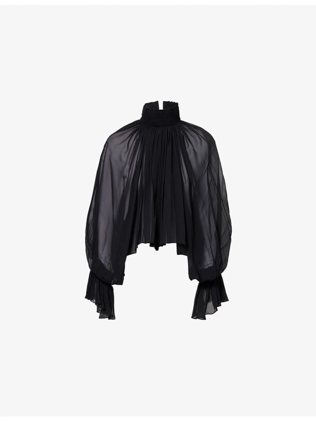 PRODUCT DETAILS - KHAITE silk top - 100% silk - Concealed hook-and-eye fastening at front - Regular fit, high neck, long sleeves, flared cuffs, sheer - Dry clean - Made in USA - True to size - Size small: length 18in / 46cm - Model is 5ft 10in/1.78m and wears a size small - Lightweight, non-stretch Ref: R04560543