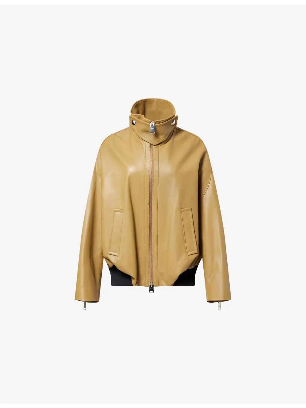 PRODUCT DETAILS - KHAITE leather jacket - 100% leather; lining 100% cupro - Zip fastening - Relaxed fit, high funnel neck collar, removable collar guard, long sleeves, zipped cuffs, welt pockets at front, two-way zip, ribbed trims, fully lined - Specialist leather clean - Made in Italy - True to size - Size small: length 28in / 71cm - Model is 5ft 10in/1.78m and wears a size small - Midweight, non-stretch Ref: R04605520