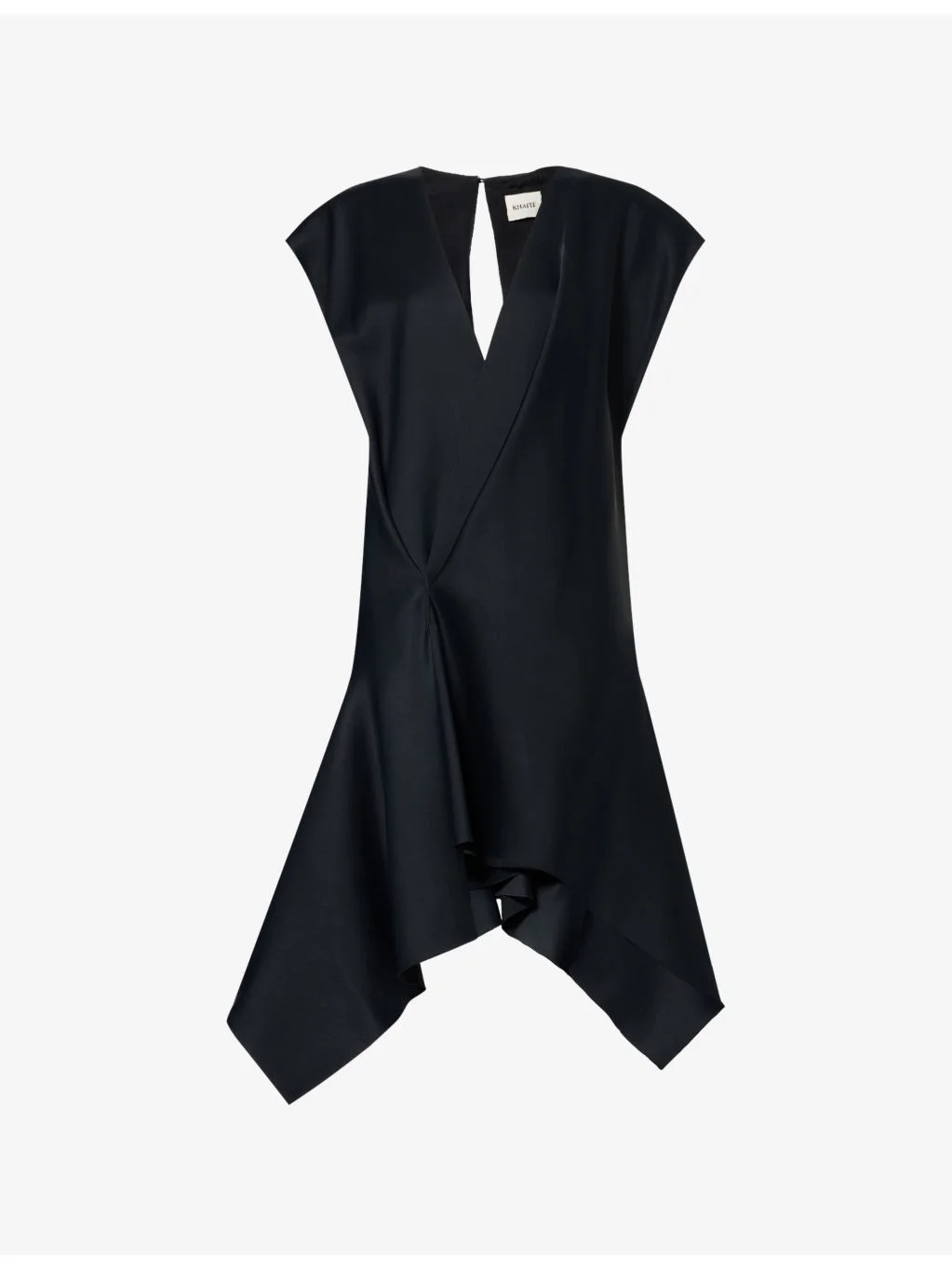 PRODUCT DETAILS - KHAITE woven mini dress - 83% acetate, 17% viscose - Button fastening at nape - Relaxed fit, V-neck, cap sleeves, asymmetric design, keyhole at back - Dry clean - Made in Italy - True to size - Size UK 8: length 35.5in / 91cm - Model is 5ft 10in/1.78m and wears a size UK 8 - Midweight, non-stretch Ref: R04560540
