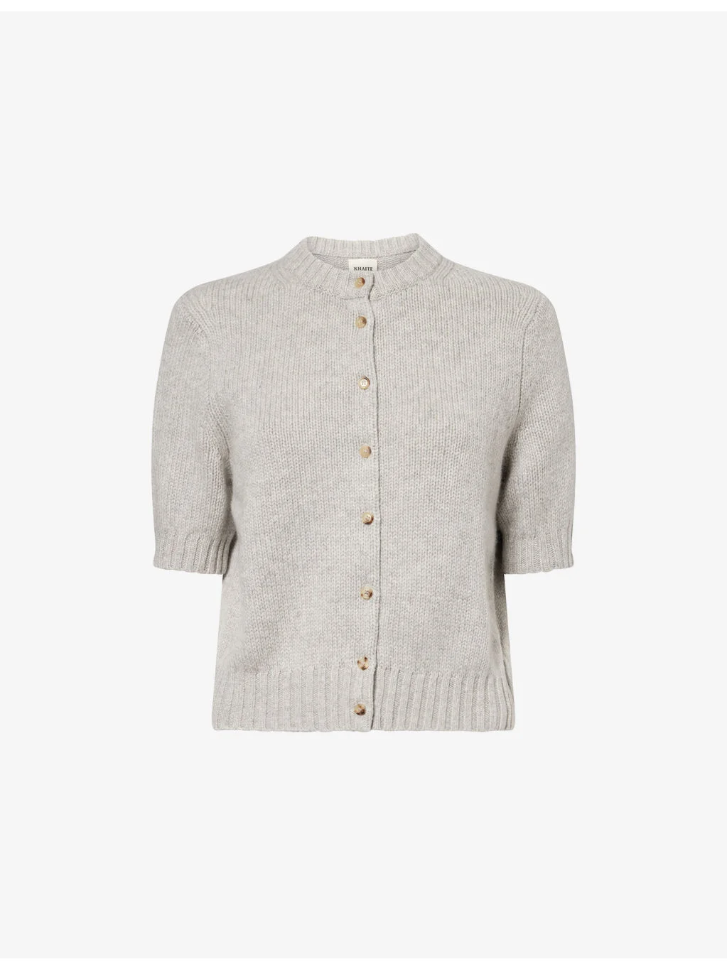 PRODUCT DETAILS - KHAITE stretch-cashmere cardigan - 95% cashmere, 5% elastane - Exposed button fastening at front - Regular fit, round-neck, short sleeves, all-over knitted, ribbed trims - Dry clean - True to size - Size small: length 18in / 47cm - Model is 5ft 10in/1.78m and wears a size small - Midweight, stretchy Ref: R04560533