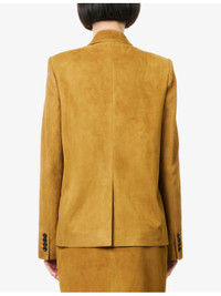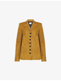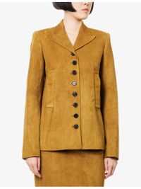 PRODUCT DETAILS - KHAITE suede jacket - 100% lamb leather; lining 100% cupro - Exposed button fastening at front - Regular fit, single-breasted, peak lapel, padded shoulders, long sleeves, buttoned cuffs, two welt pockets at front, all-over suede leather, fully lined, single vent - Specialist leather clean - Made in USA - True to size - Size UK 8: length 26in / 67cm - Model is 5ft 10in/1.78m and wears a size UK 8 - Midweight, non-stretch Ref: R04534038