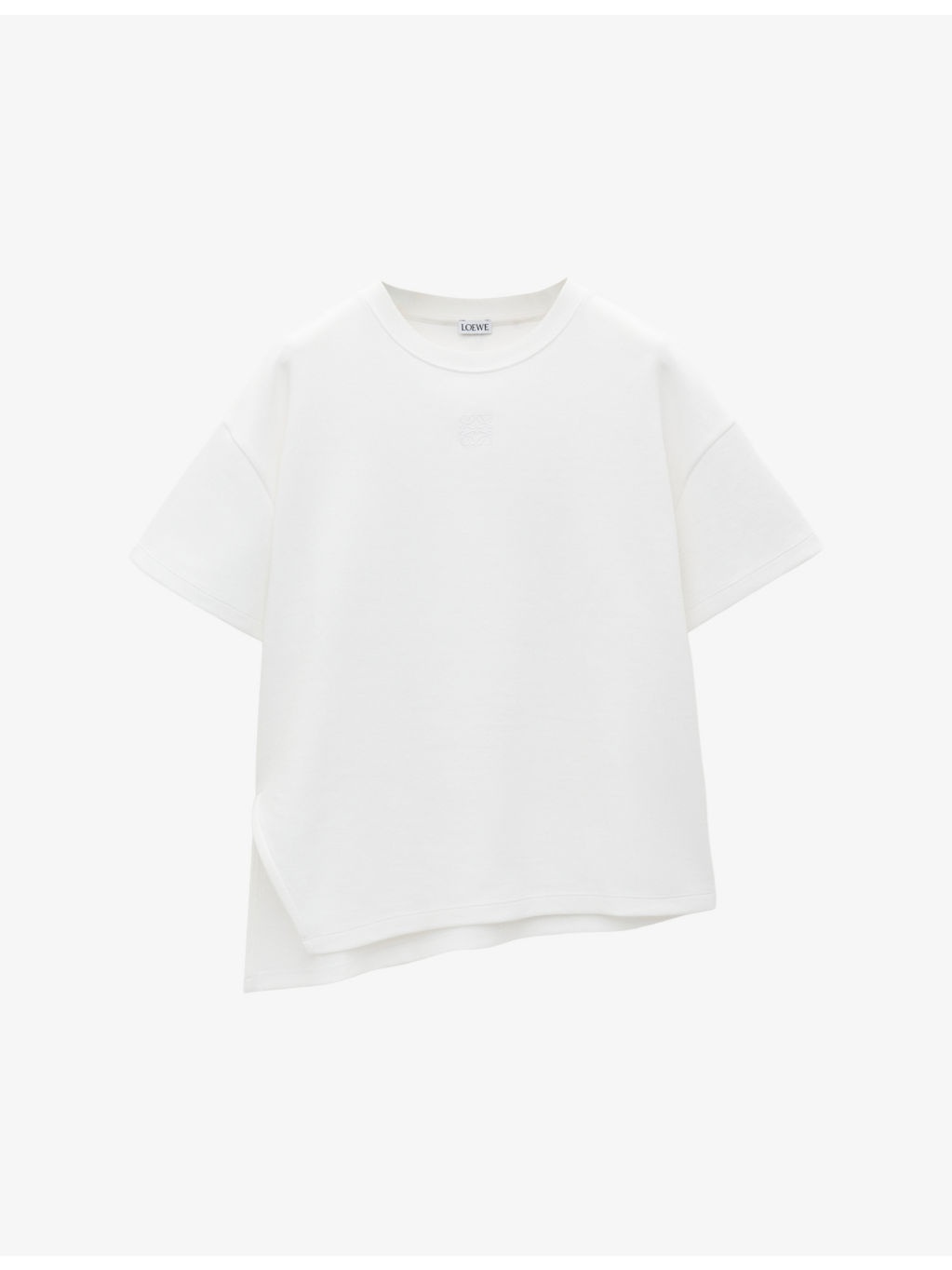 PRODUCT DETAILS - Loewe cotton-blend jersey T-shirt - 84% cotton, 16% polyamide - Slips on - Boxy, relaxed fit, round neck, short sleeves, Anagram logo embroidery to the front, asymmetric hem, diagonal cut-out hem - Machine wash cold - Made in Italy - True to size - Lightweight, non-stretch Ref: R04372131