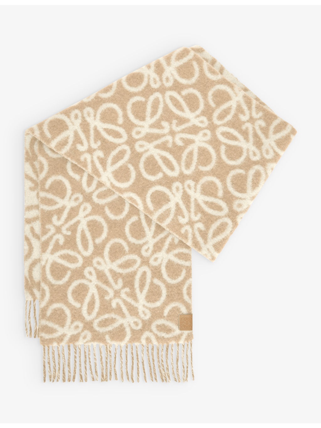 PRODUCT DETAILS - Loewe wool and alpaca-blend scarf - 47.5% alpaca, 28.5% wool, 19% polyamide, 5% leather - Self-tie fastening - All-over Anagram pattern, brushed texture, reversible, fringed edges, logo patch, contrast stitching - Length 200cm, width 35cm - Dry clean only Ref: R04180178