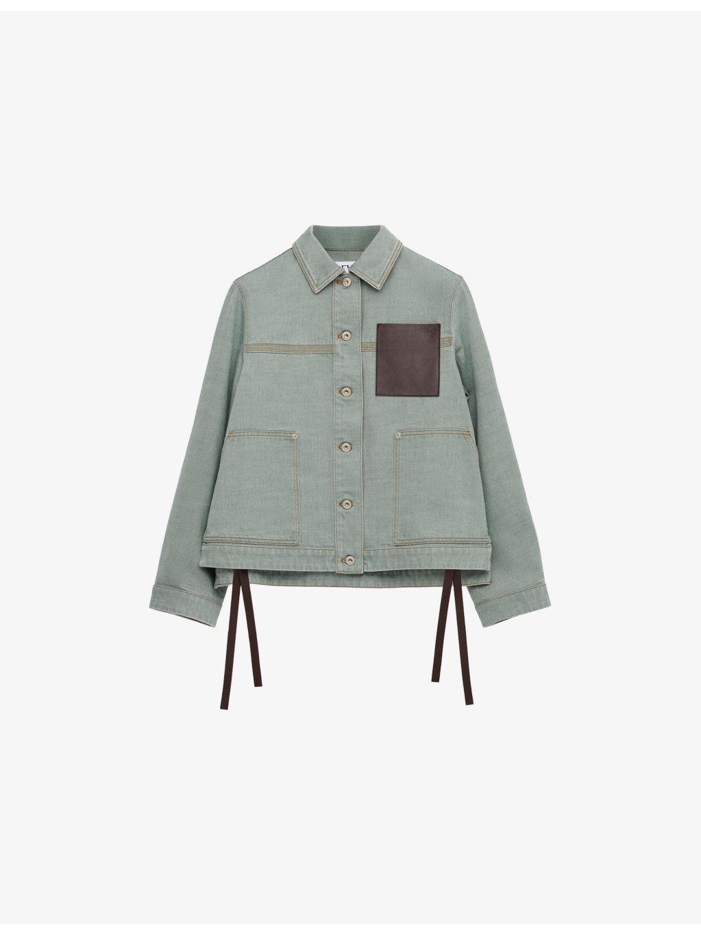 PRODUCT DETAILS - Loewe cotton jacket - 100% cotton; contrast 100% leather - Button fastening - Relaxed fit, collar, long sleeves, anagram patch at chest, pockets at front, contrast stitching, vintage wash, branded hardware - Dry clean only - True to size - Model is 5ft 10in/1.78m and wears a size UK 8 - Midweight, non-stretch Ref: R04493200