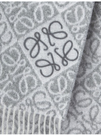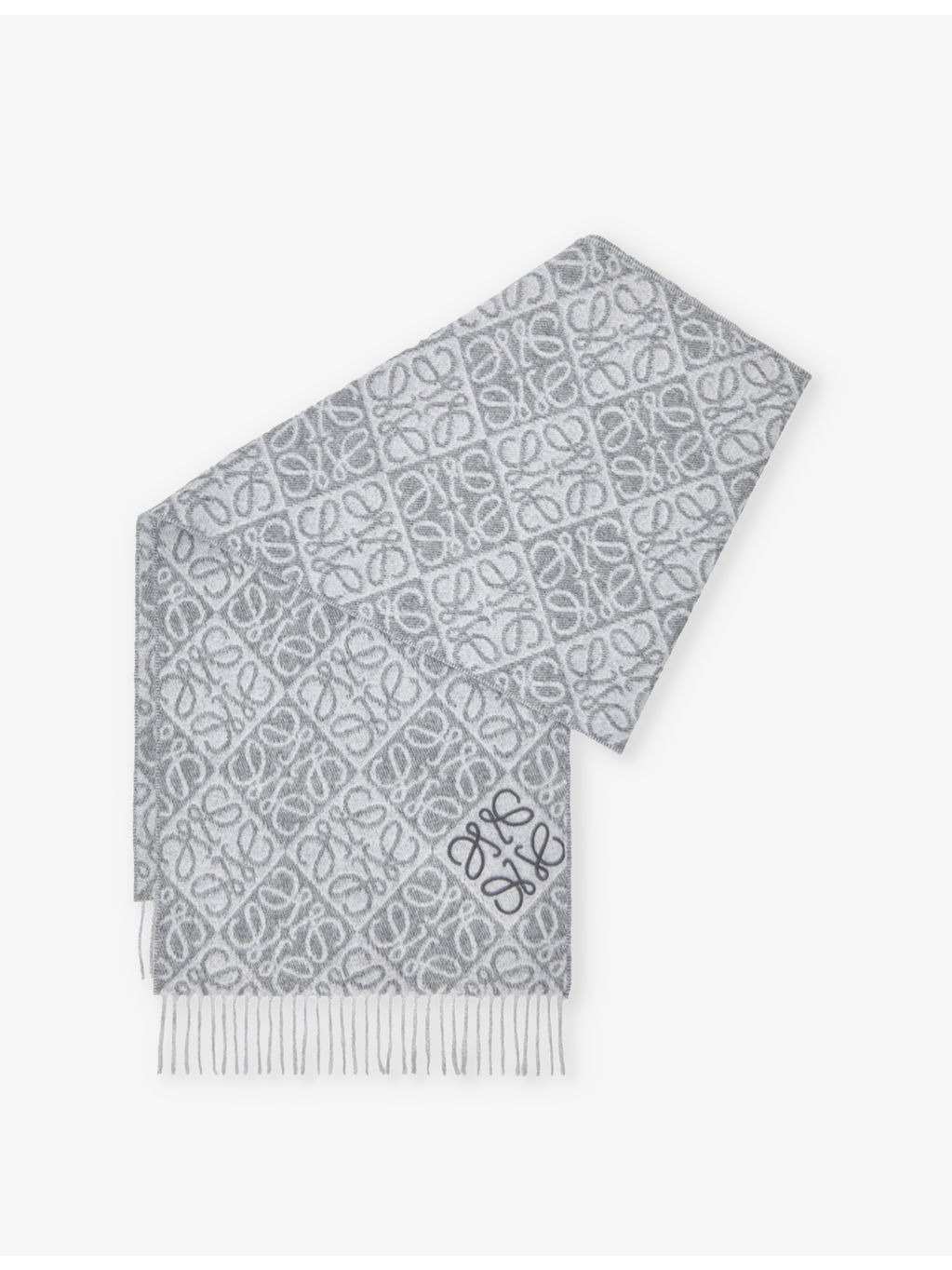 PRODUCT DETAILS - Loewe wool and cashmere-blend scarf - 85.5% wool, 9.5% cashmere, 5% polyester - Self-tie fastening - Two-tone Anagram jacquard pattern, fringed edges, brand embroidery at corner, double-face design - Length 180cm, width 38cm - Dry clean Ref: R04409968