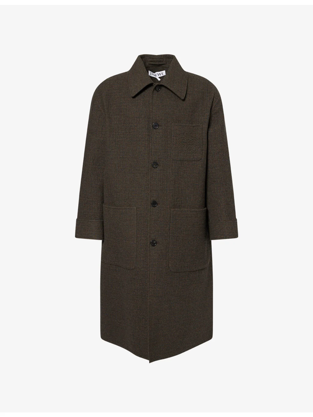 PRODUCT DETAILS - LOEWE wool and silk coat - 99% wool, 1% silk - Exposed button fastening at front - Relaxed fit, spread-collar, long sleeves, buttoned cuffs, embossed anagram and three patch pockets at front, brushed, unlined, single vent - Dry clean - Made in Italy - Size UK 40: length 46in / 118cm, chest 46in / 117cm - Model is 6ft 2in/1.88m and wears a size UK 40 - Midweight, stretchy Ref: R04565712