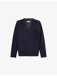 PRODUCT DETAILS - LOEWE wool and cashmere cardigan - 85% wool, 15% cashmere; embellishments 100% calf leather; embroidery 100% polyester - Exposed button fastening at front - Relaxed fit, V-neck, long sleeves, three patch pockets and embossed anagram at front, brushed, internal check print and leather anagram patch pocket - Dry clean - Made in Italy - Size UK 40: length 28in / 71cm, chest 46in / 117cm - Model is 6ft 2in/1.88m and wears a size UK 40 - Midweight, slight stretch Ref: R04565717