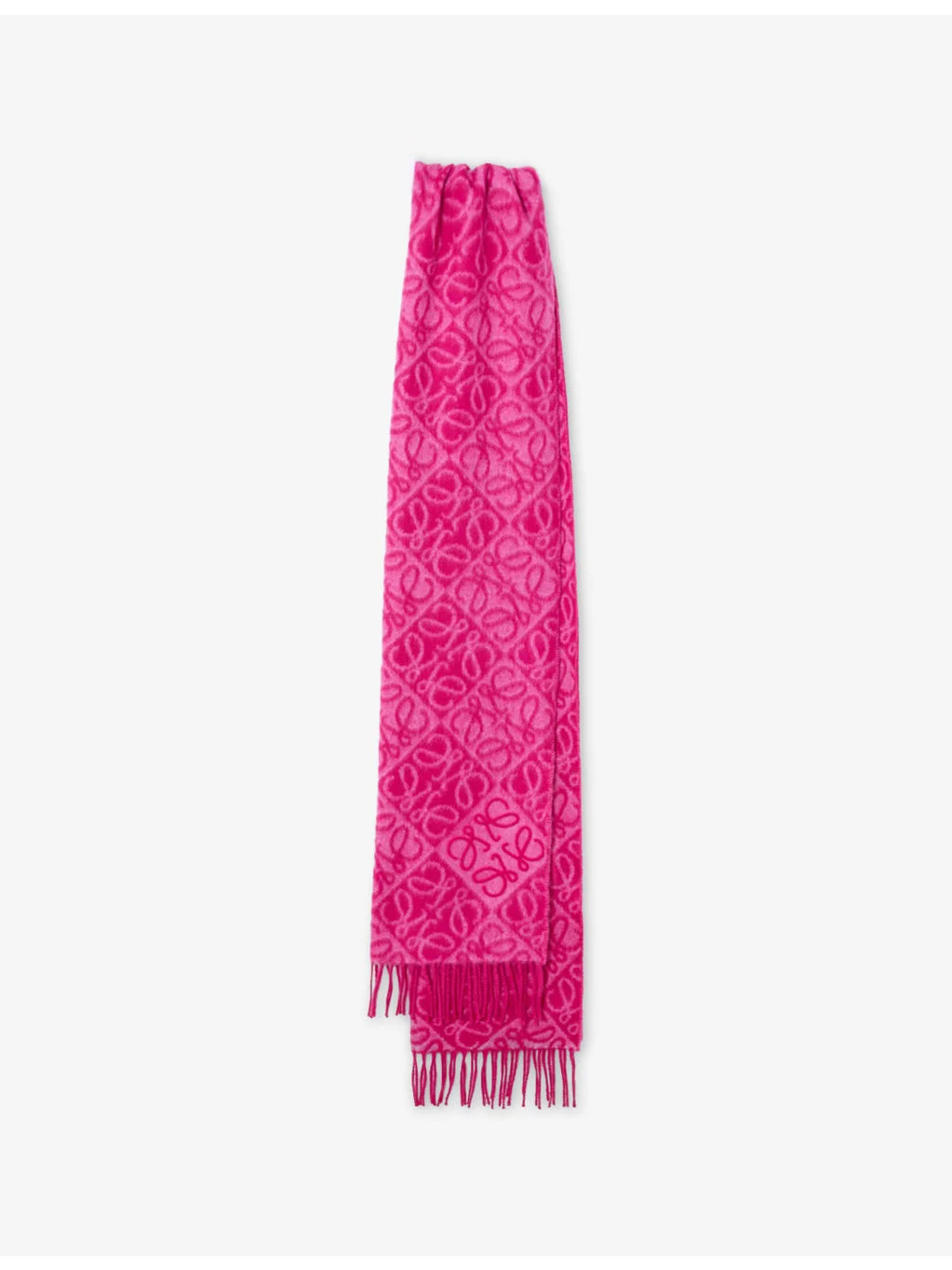 PRODUCT DETAILS - Loewe wool and cashmere scarf - 90% wool, 10% cashmere - Self-tie fastening - Rectangular silhouette, fringed edges, branded Anagram pattern - Length 180cm, width 38cm - Dry clean Ref: R04567214