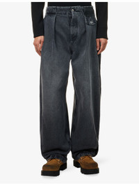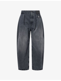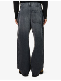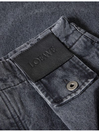 PRODUCT DETAILS - Loewe denim jeans - 100% cotton; embellishments 100% calf leather; pocketlining 65% polyester, 35% cotton - Exposed button and concealed button-fly fastening at front - Relaxed fit, high-rise, barrel leg, belt loops, two slip pockets and pleated at front, buttoned pocket and brand patch at front, patch pocket at back, faded wash and whiskering - Dry clean - Made in Italy - Size UK 32: rise 15in / 39cm, inside leg 29in / 75cm, leg opening 18in / 46cm - Model is 6ft 2in/1.88m and wears a size UK 32 - Midweight, slight stretch Ref: R04565729