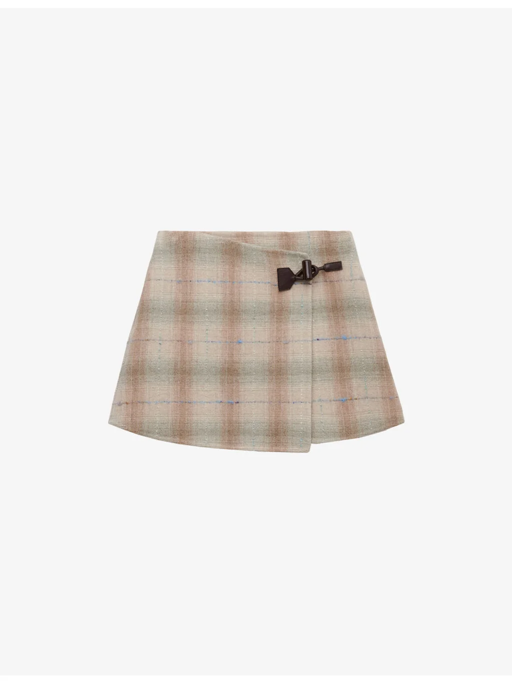 PRODUCT DETAILS - Loewe wool-cashmere blend skirt - 55.2% wool, 20.8% cashmere, 15% lamb leather, 5% calf leather, 1.6% silk, 0.8% viscose, 0.8% alpaca, 0.8% polyamide - Toggle fastening at front - Wrap over design, all-over check print, mini length - Specialist dry clean only - Made in Italy - True to size - Midweight, non-stretch Ref: R04566964