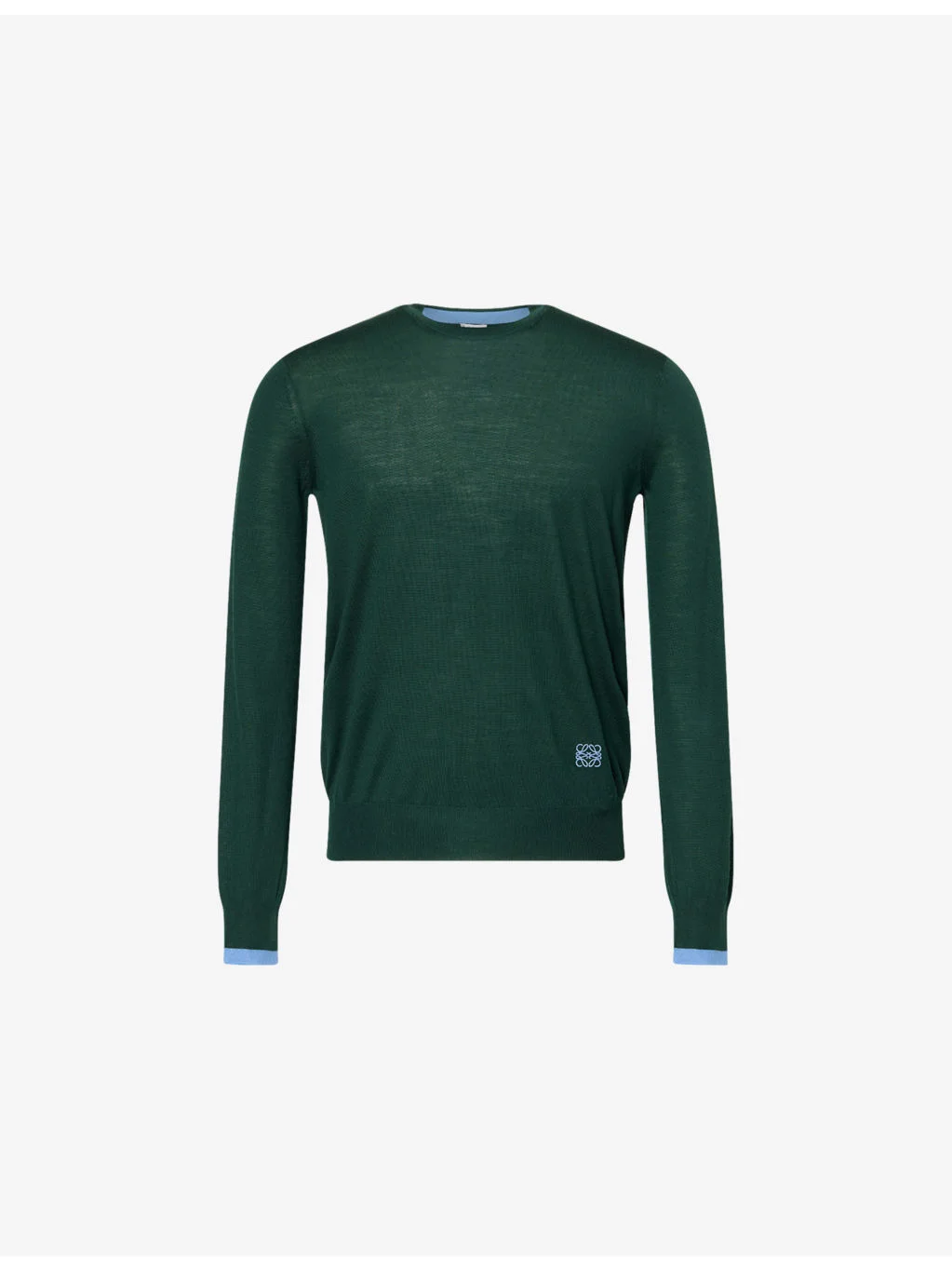 PRODUCT DETAILS - Loewe wool jumper - 100% wool; embroidery 100% polyester - Regular fit, crewneck, long sleeves, contrast cuffs, monogram embroidery at front, all-over fine-knit pattern, ribbed trims - Dry clean - Made in Italy - Model is 6ft 2in/1.88m and wears a size medium - Lightweight, stretchy Ref: R04565759