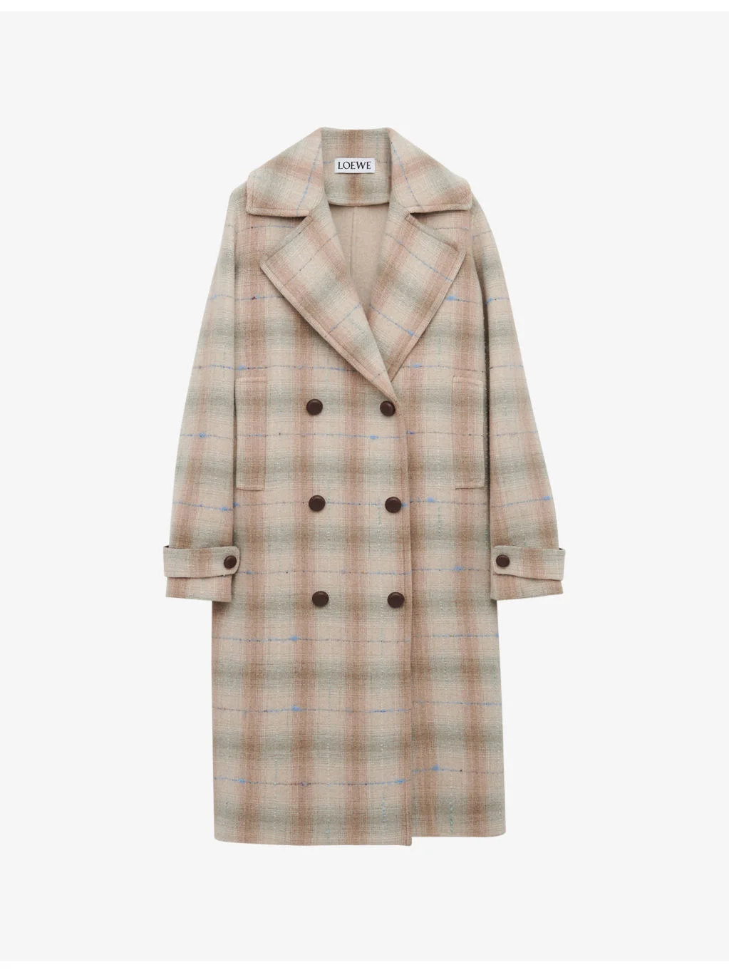 PRODUCT DETAILS - Loewe wool-cashmere blend coat - 62.1% wool, 23.4% cashmere, 10% calf leather, 1.8% silk, 0.9% viscose, 0.9% alpaca, 0.9% polyamide - Exposed button fastening at front - Double breasted, notched collar, long sleeves, buttoned cuffs, two welt pockets at front, all-over checked pattern - Dry clean only - Made in Italy - True to size - Midweight, non-stretch Ref: R04566931