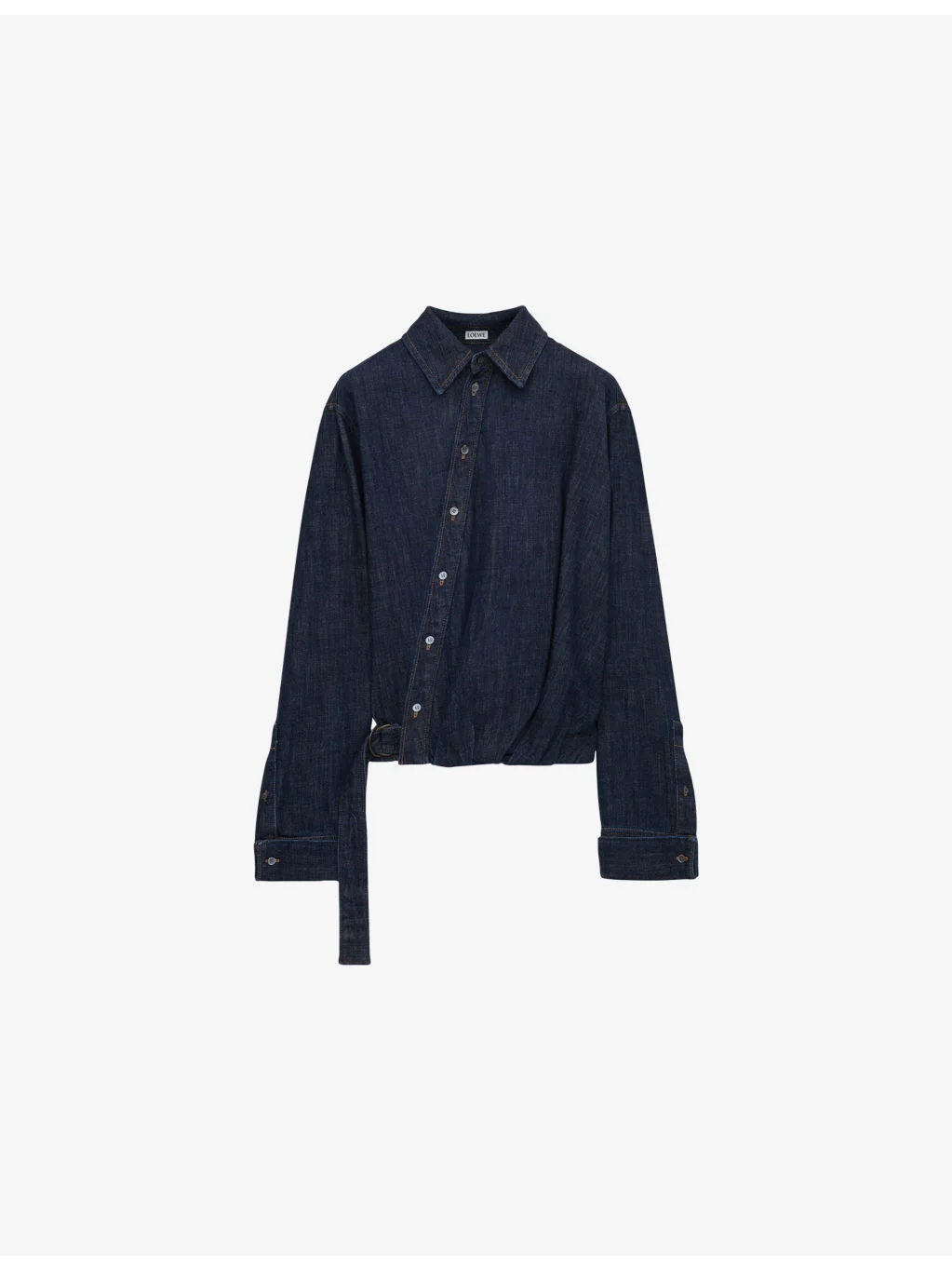 PRODUCT DETAILS - Loewe denim shirt - 96.03% cotton, 3% polyester, 0.97% polyurethane - Button fastening - Pointed collar, long sleeves, buttoned cuffs, adjustable belt at waist, draped detailing - Dry clean - Made in Italy - True to size - Lightweight, slight stretch Ref: R04567002