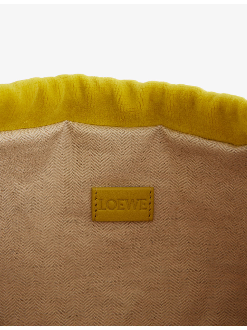 PRODUCT DETAILS - Loewe cotton pouch - 100% cotton; contrast 100% calf leather - Drawstring closure - Square shape, debossed branding at front, all-over terry texture, leather trims, one main compartment, internal brand patch, fully lined - Height 38.5cm, width 38.5cm, depth 3cm - Dry clean - Made in Spain - Comes with a dust bag Ref: R04459704