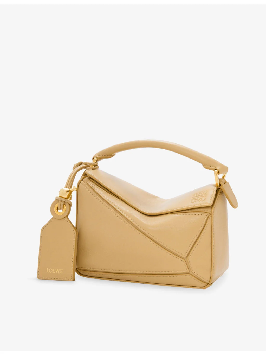 PRODUCT DETAILS - Loewe leather top-handle bag - 100% lambskin leather - Zip fastening - Cuboid shape, top handle, detachable adjustable strap, logo engraving, detachable logo-embossed tag, baguette-shaped metal feet, one main compartment, brand-engraved interior plaque, gold-toned hardware - Height 12.5cm, width 17.5cm, depth 7.5cm - Specialist leather clean - Made in Spain Ref: R04567052