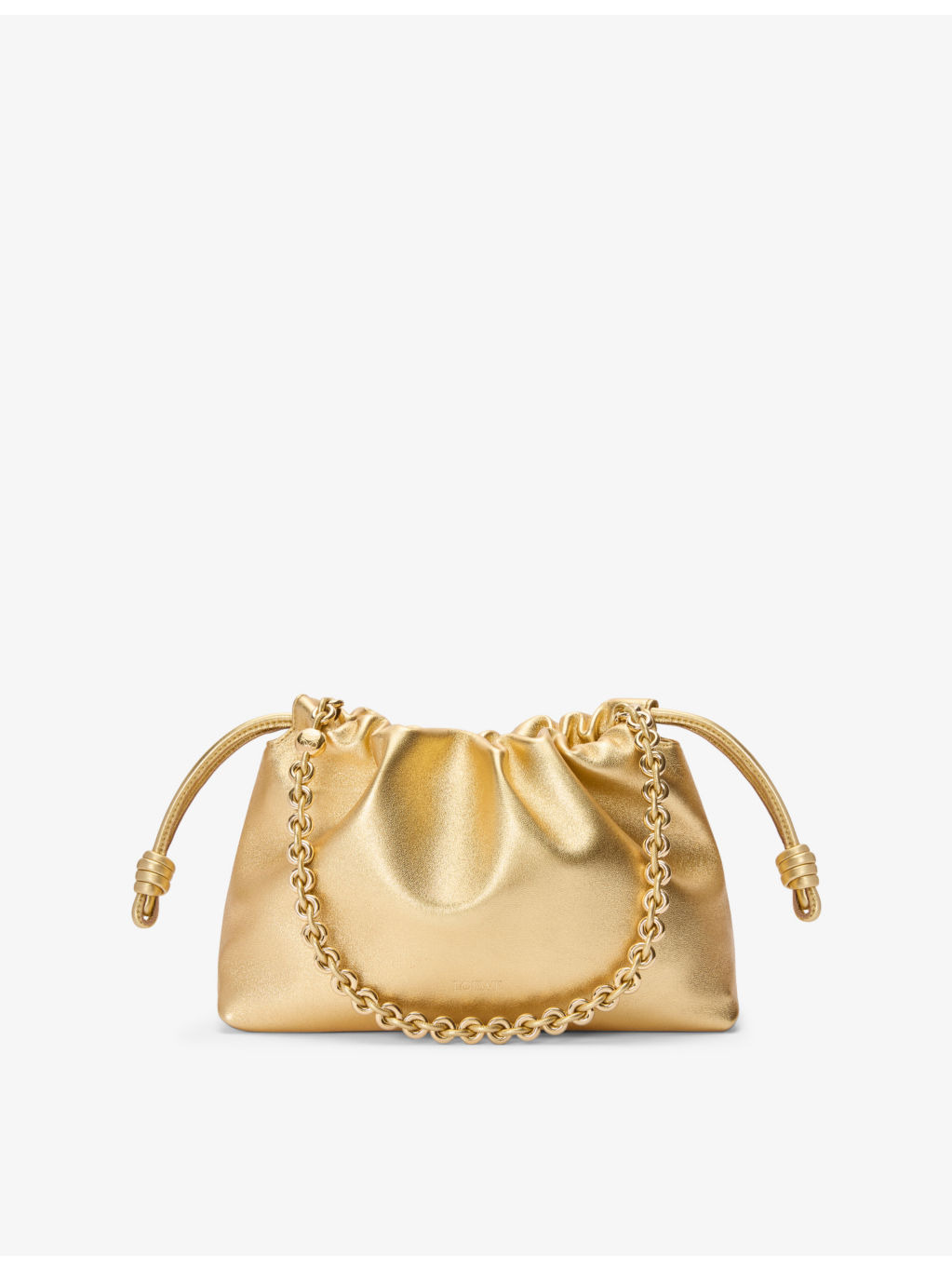 PRODUCT DETAILS - Loewe leather shoulder bag - 100% leather - Magnetic fastening - Detachable and adjustable leather shoulder strap, chain strap, drawstring pulls, coiled knots, foiled branding to the front, one main internal compartment, suede lining, metallic leather - Height 20cm, width 30cm, depth 10.5cm - Specialist leather clean - Made in Spain - Comes in a branded box Ref: R04410105