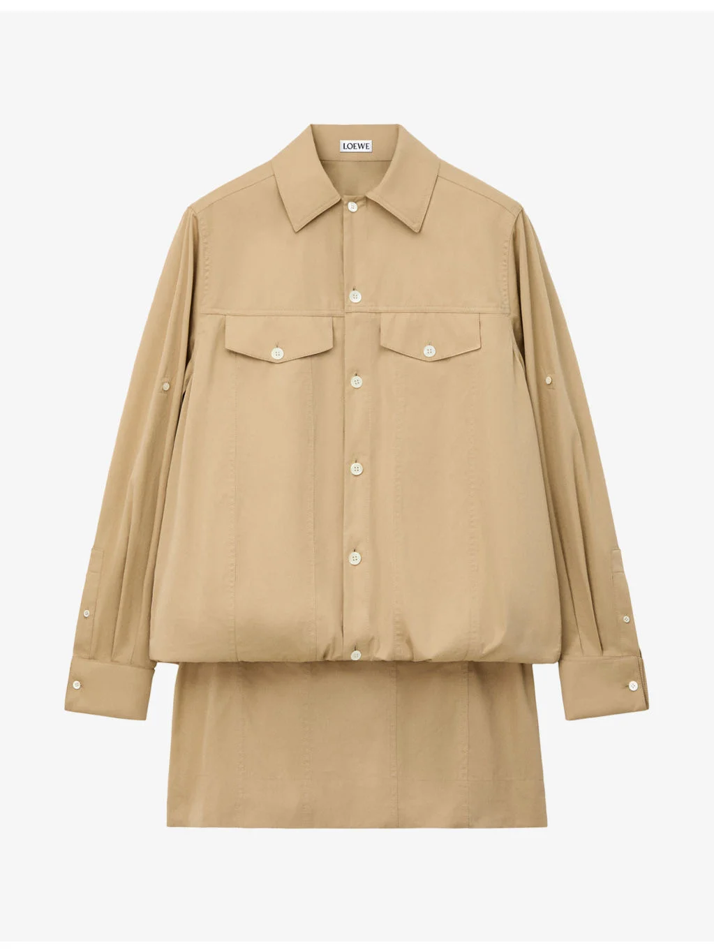 PRODUCT DETAILS - LOEWE cotton-blend mini dress - 82.45% cotton, 14.55% silk, 3% polyester - Exposed button fastening at front - Relaxed fit, collar, long sleeves, dropped shoulders, buttoned flap pockets, buttoned cuffs, puffed waist, sleeveless vest underlayer, brand embroidery, A-line skirt - Dry clean only - Made in Italy - True to size - Lightweight, non-stretch Ref: R04616401
