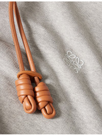 PRODUCT DETAILS - LOEWE cotton-jersey hoodie - 100% cotton; embellishments 100% lamb leather; embroidery 100% polyester; trims 100% cotton - Relaxed fit, leather drawstring at hoodie, long sleeves, anagram embroidery at front, all-over melange print, ribbed trims - Dry clean - Made in Portugal - Model is 6ft 2in/1.88m and wears a size medium - Midweight, stretchy Ref: R04565752