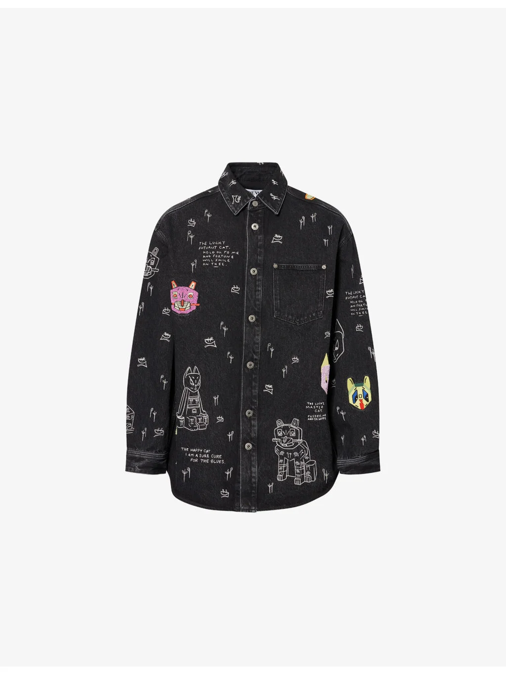 PRODUCT DETAILS - LOEWE denim overshirt - 100% cotton; embroidery 100% polyester - Exposed button fastening at front - Spread collar - Buttoned cuffs - Relaxed fit, collar, long sleeves, patch pocket at front, straight yoke and pleat at back, all-over cat and text embroidery, anagram embroidery at back, curved hem - Dry clean - Made in Italy - Size medium: length 32in / 82cm, chest 52in / 132cm - Model is 6ft 2in/1.88m and wears a size medium - Midweight, slight stretch Ref: R04565731